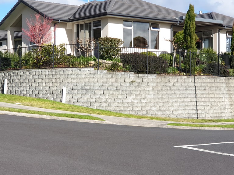 Keystone Block retaining walls backfilled with no fines concrete, tight curves up the driveways.