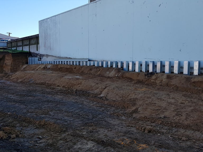 Cantilevered steel pole retaining wall and steel palisade retaining wall on the boundary protecting neighbouring building prior to the site excavation.