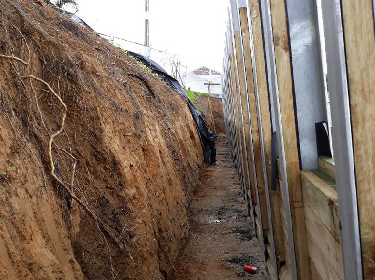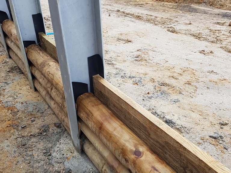 Cantilevered Steel Pole retaining wall, 3.0m high with thick timber lagging for the design loads.